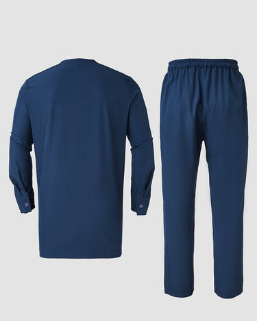 Closure Type: Drawstring trousers, a button-up shirt, and a pullover outer robe.