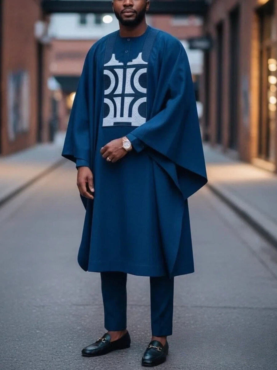 Step up your style game with this African Embroidery Agbada 3 Pieces Set for Men. This vibrant, intricately embroidered set includes a flowing agbada robe, matching inner wear, and a coordinating hat—perfect for turning heads at any event. Comfortable and bold, it lets you celebrate tradition with a modern, playful twist.