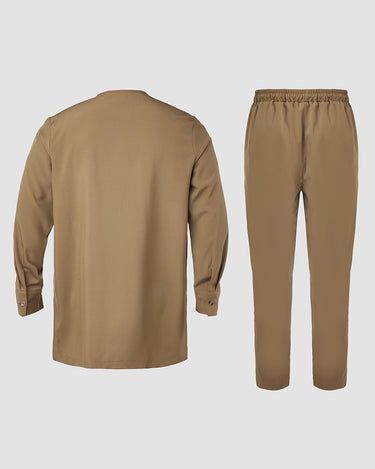 Closure Type: Drawstring trousers, a button-up shirt, and a pullover outer robe.