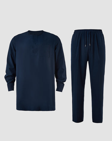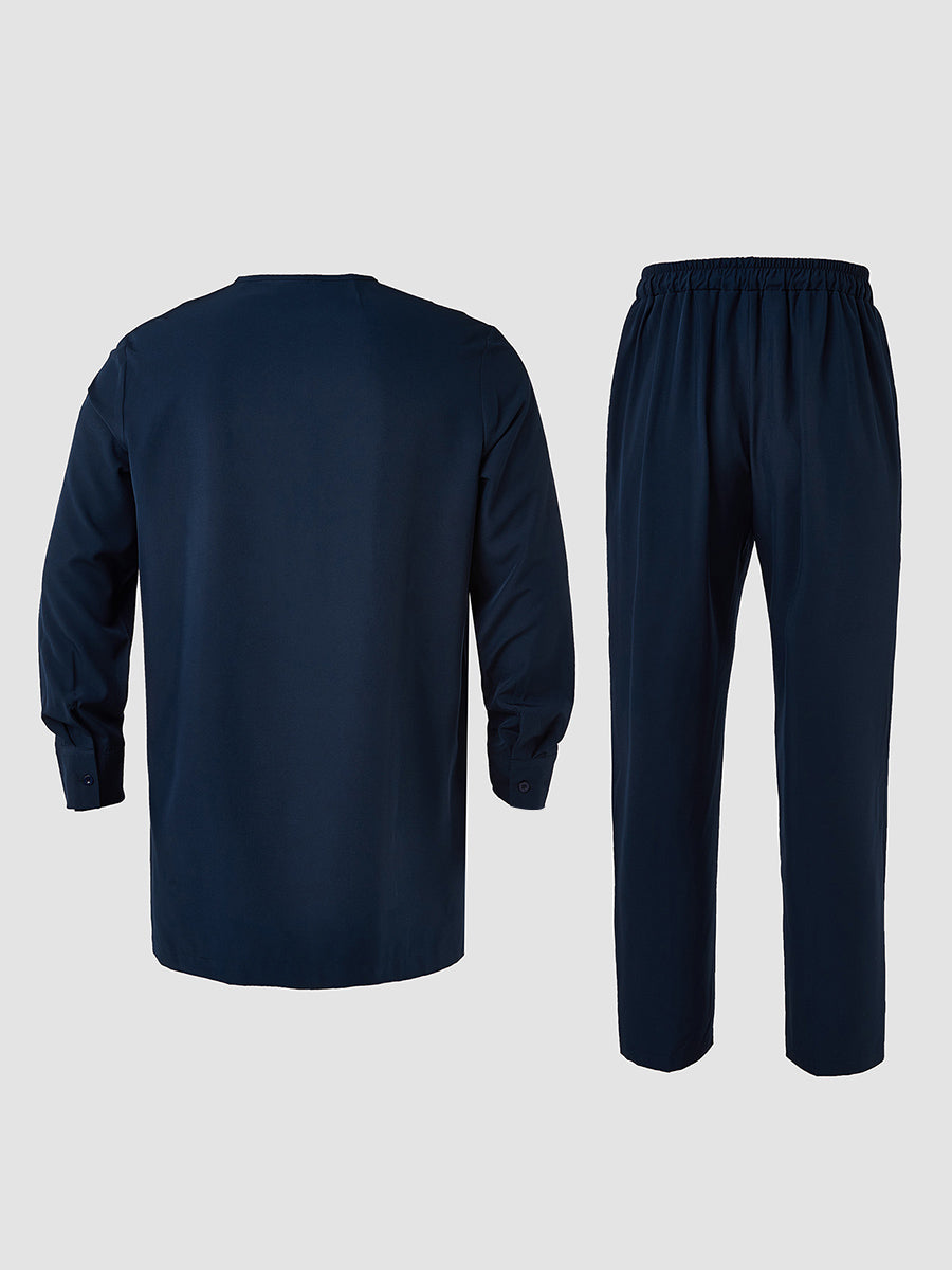 • Closure Type: Drawstring trousers, a button-up shirt, and a pullover outer robe.