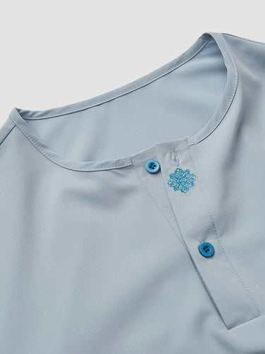 Closure Type: Drawstring trousers, a button-up shirt, and a pullover outer robe.