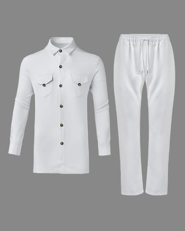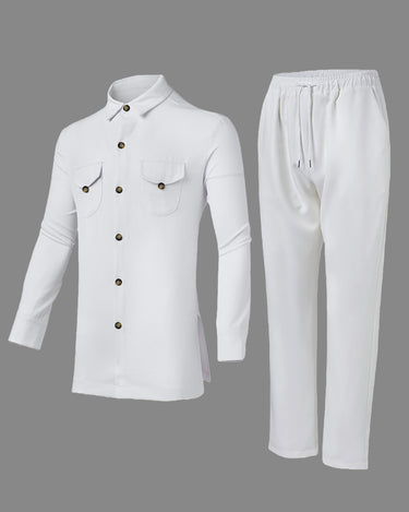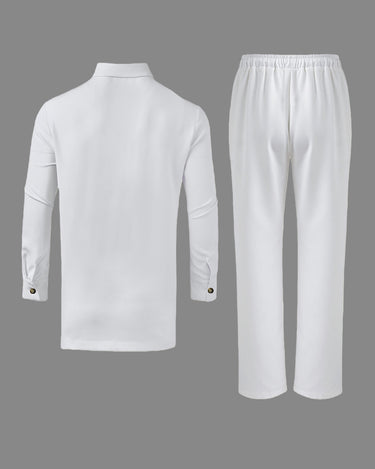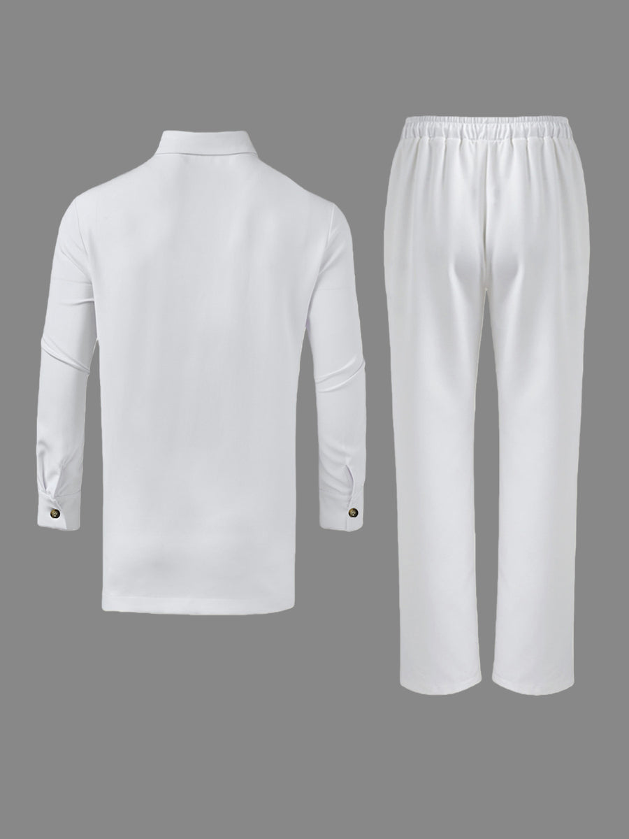 Step up your style game with this White Long Sleeve Button Down Men's Set. Perfect for any occasion, its crisp white fabric and classic button-down design keep you looking sharp and feeling confident. Whether you're heading to a casual hangout or a semi-formal event, this set adds a fresh, clean vibe to your wardrobe with a playful twist. Easy to mix and match, it’s your new go-to for effortless cool.