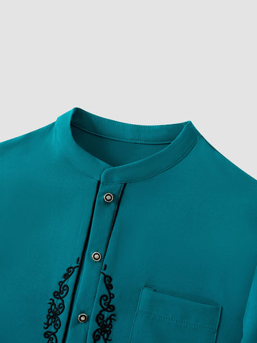 1. Stylish Design: Band collar, embroidery and button create a standout look.