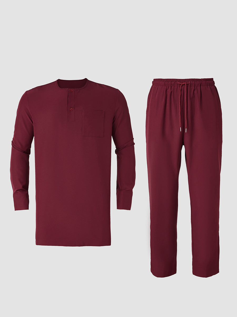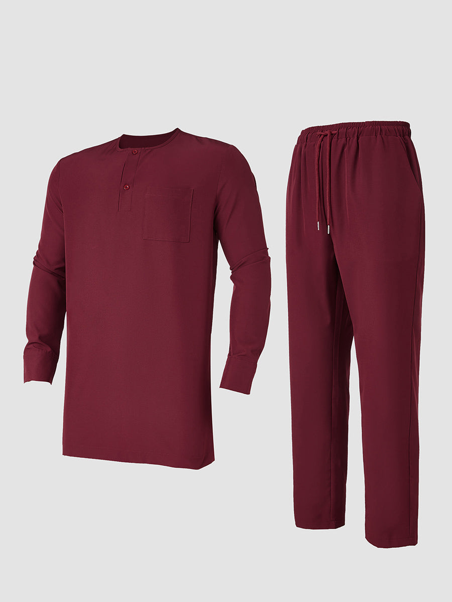 • Closure Type: Drawstring trousers, a button-up shirt, and a pullover outer robe.