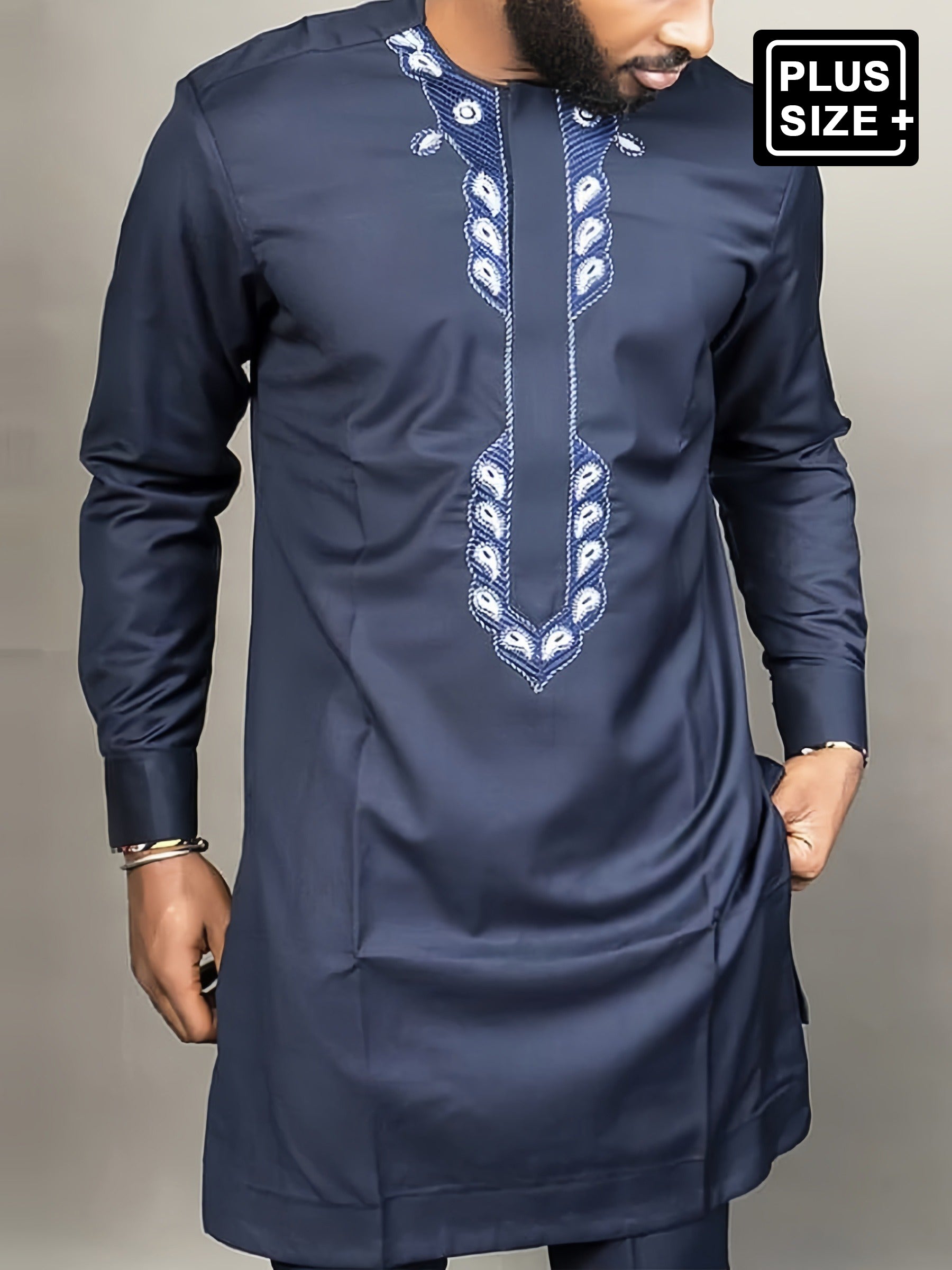 Step up your style game with this Plus Size Blue Dashiki Ethnic Embroidered Men's Set. Featuring intricate embroidery and a bold dashiki print, this set is perfect for adding a pop of culture to your wardrobe. Stand out in a sea of boring fashion with this statement-making set!