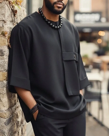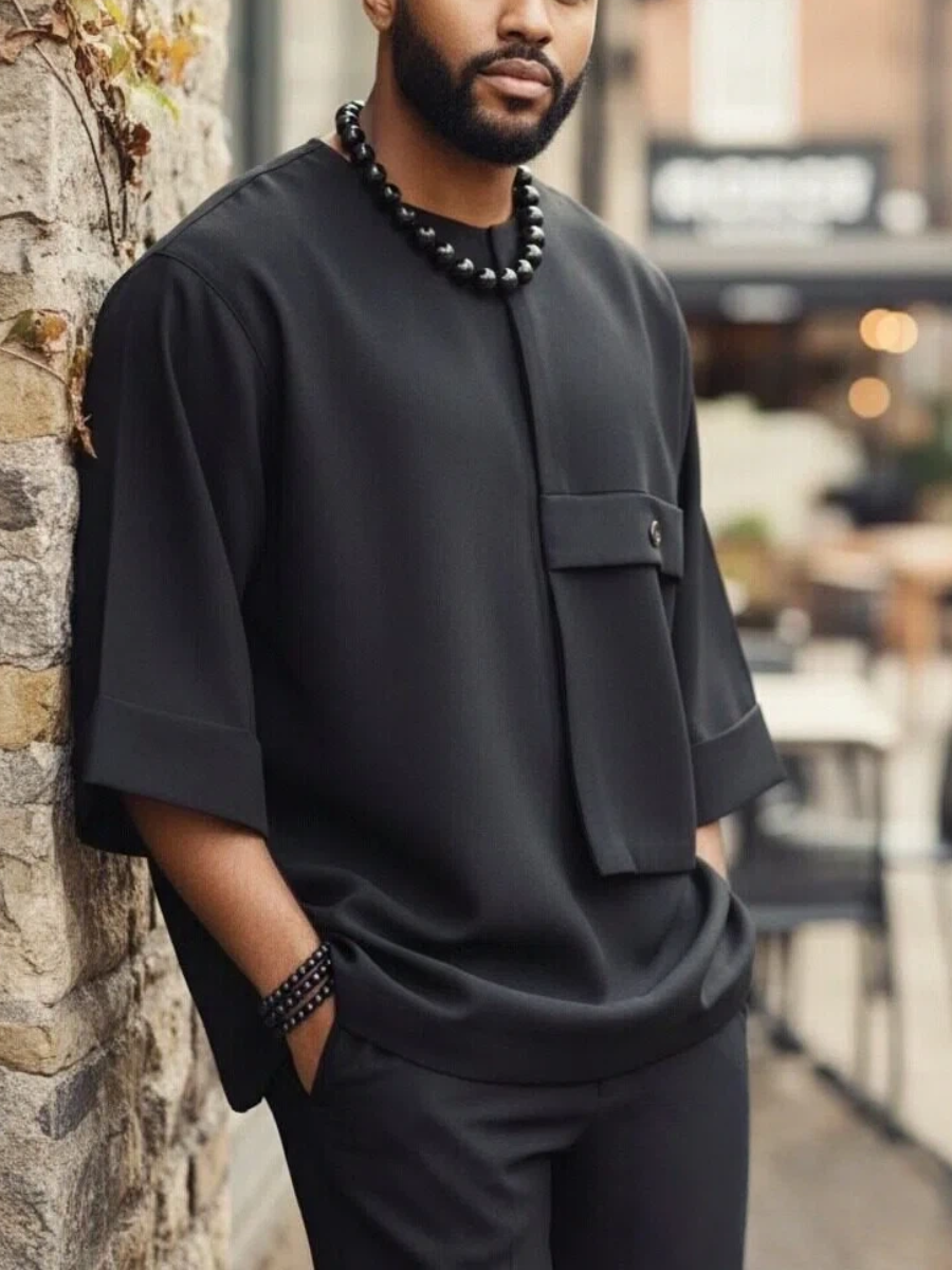 Entfesseln Sie Ihre innere Stilikone mit unserem lässigen Rundhals-Set mit schwarzen, schlichten Knöpfen für Männer. Mit seinem einzigartigen und trendigen Design heben Sie sich von der Masse ab. Dieses Set ist bequem und mühelos cool und eignet sich perfekt für jeden lässigen Anlass. Machen Sie sich bereit, ein Statement abzugeben!